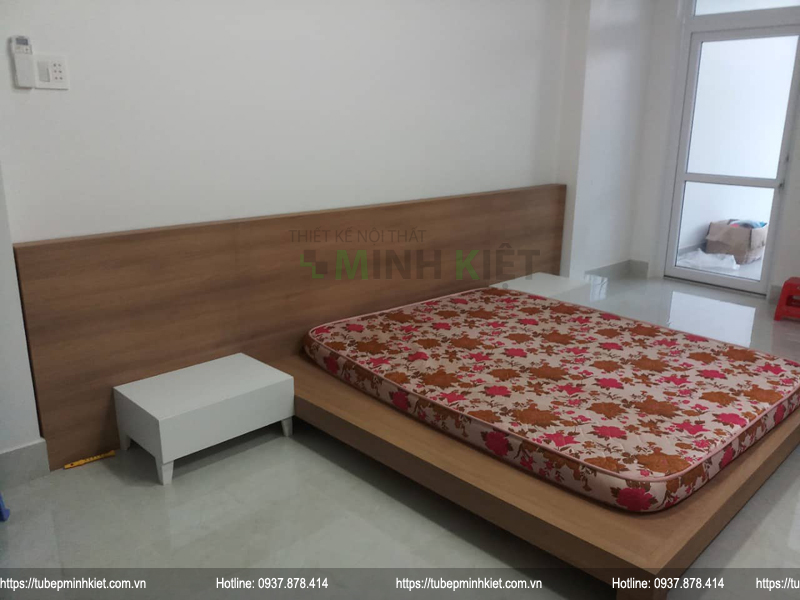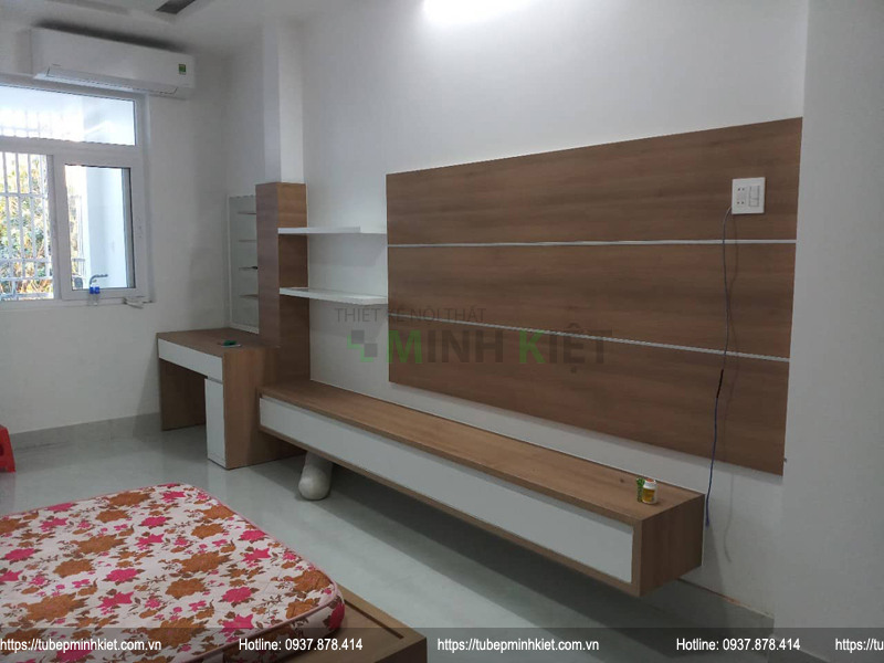 Công trình nội thất phòng ngủ nhà cô Vượng được Minh Kiệt thi công tại quận 4 với giường ngủ, tủ đầu giường, và kệ tivi.